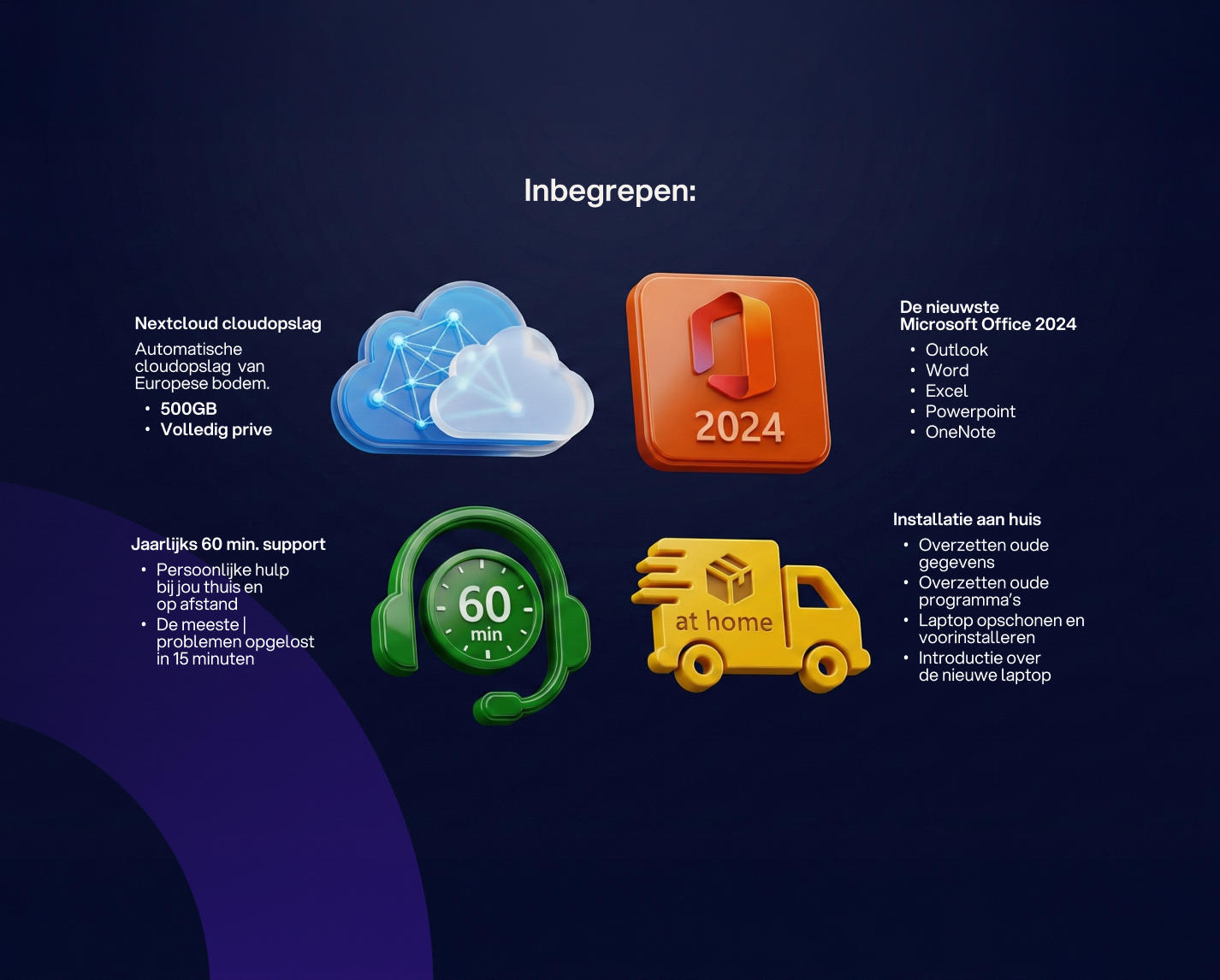 Alles wat je nodig hebt: de laptop zelf, oplader, software, updates, beveiliging, back-up van je bestanden en persoonlijke hulp wanneer je die nodig hebt.
