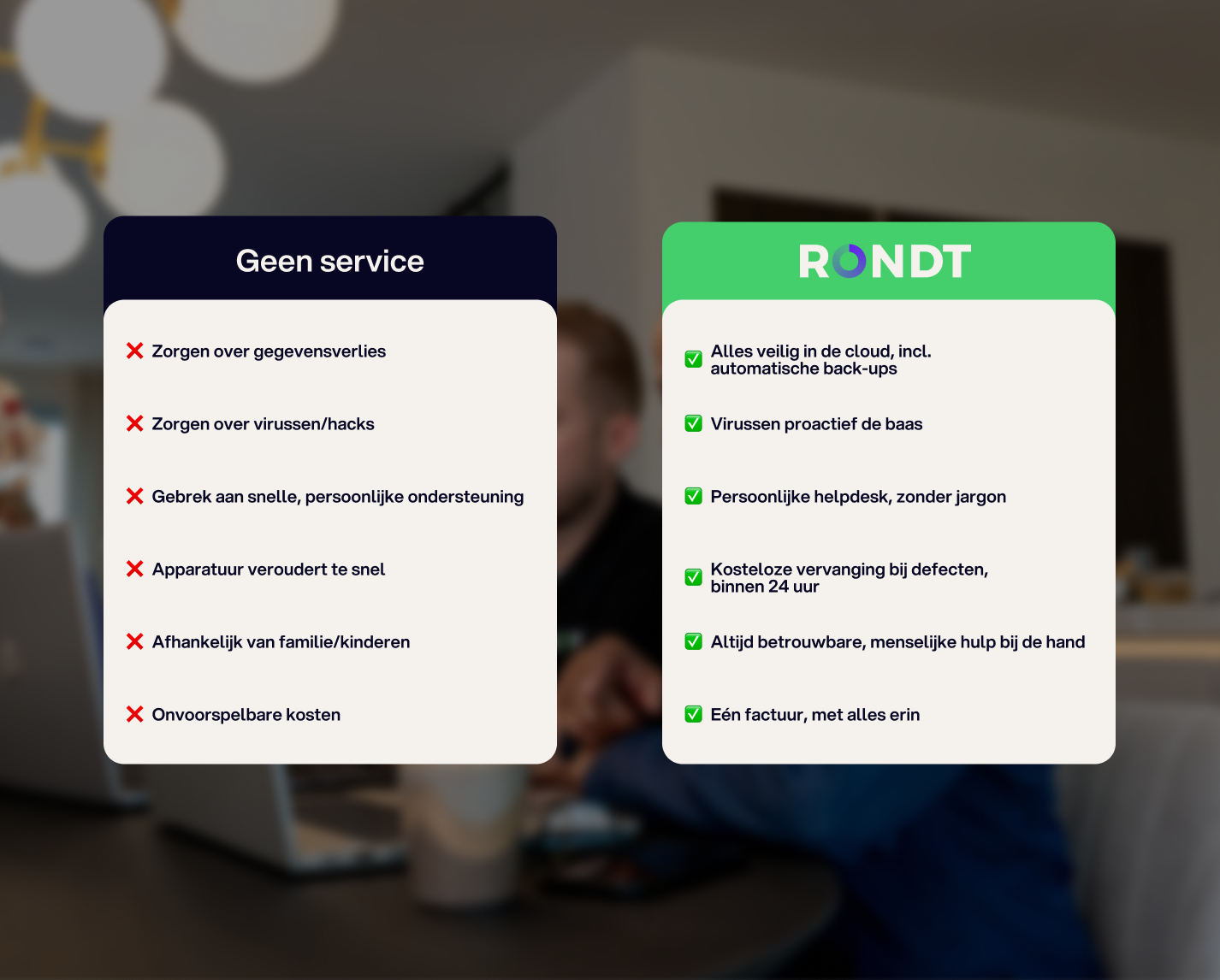 Bij Rondt gaan we voor een lange termijn relatie, geen eenmalige aankoop. We zorgen voor transparantie in kosten, geen verrassingen. De exacte looptijden staan in onze voorwaarden, maar ons doel is om u zorgeloos en duurzaam digitaal te laten werken.